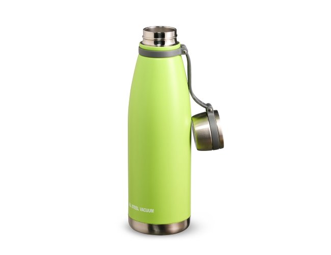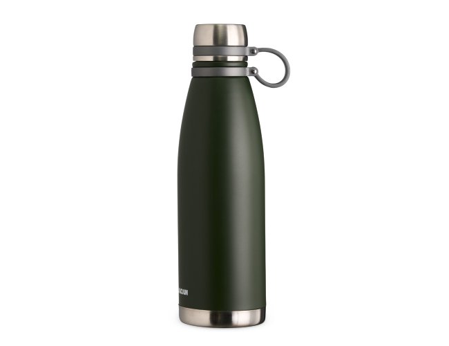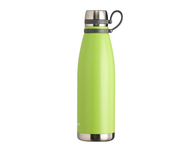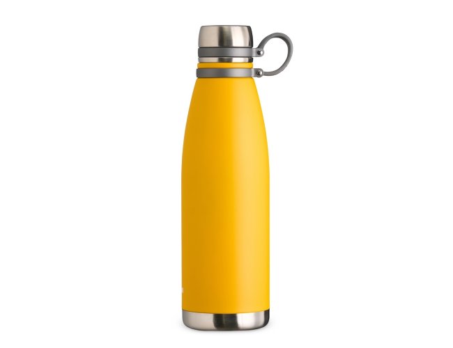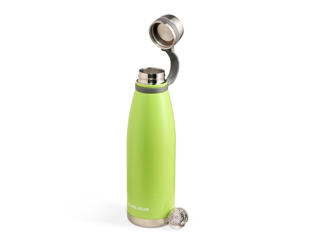 Garrafa térmica com infusor de bebidas, feita em inox 316 com capacidade de 1,1 litros e alça de silicone acoplada na tampa.