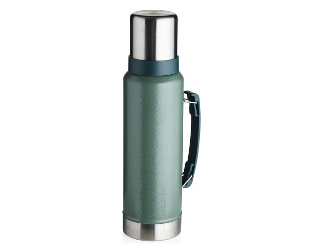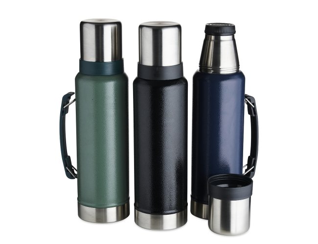 Garrafa térmica de inox livre de BPA com capacidade de 1,4 litro. Contém alça para transporte e pintura texturizada.