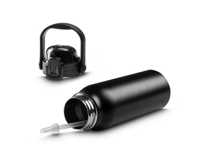 Garrafa Térmica feita em Inox 304, capacidade de 1,6L. Possui tampa rosqueável com trava de segurança e botão de acionamento para abrir a tampa protetora do bocal. Acompanha canudo e dois bicos, sendo um de silicone e outro de plástico.