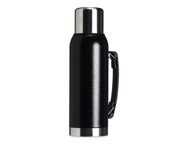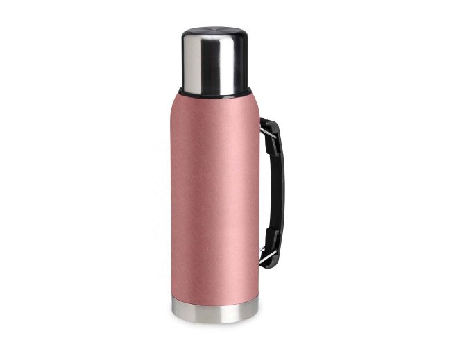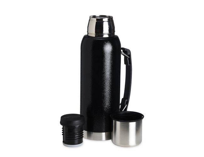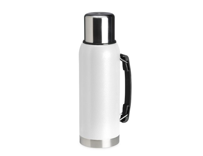 Garrafa térmica de inox livre de BPA com capacidade de 1 litro. Contém alça para transporte.