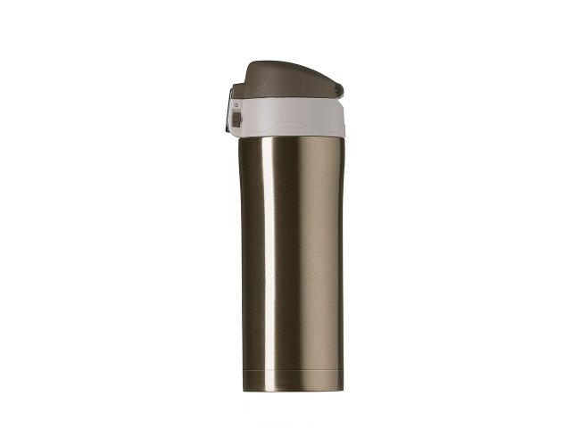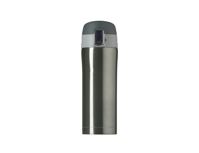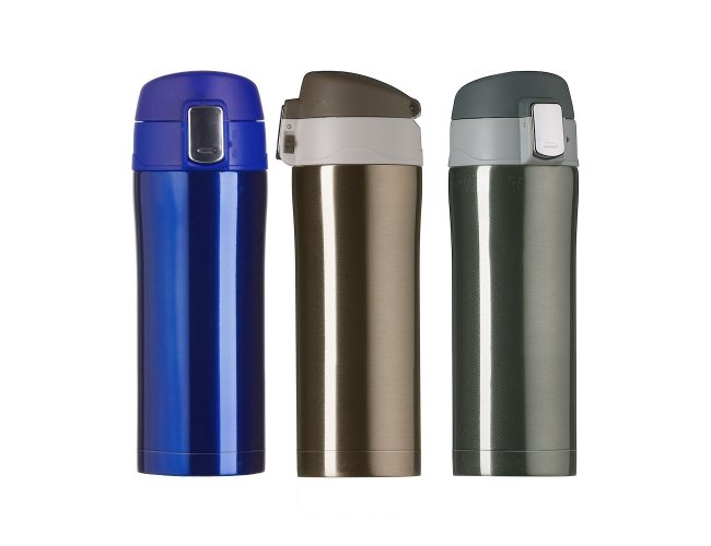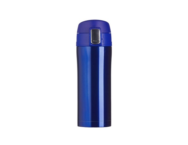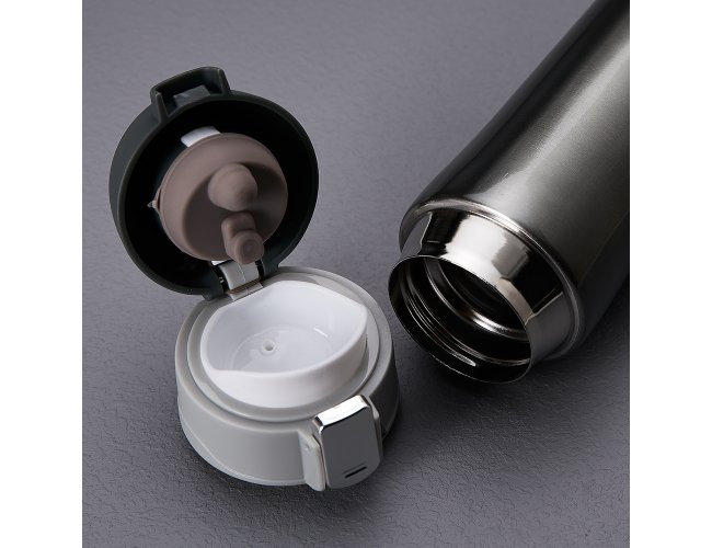 Garrafa térmica 320ml colorida com sistema de trava. Material metálico com revestimento interno em inox, possui tampa plástica fosca com borracha interna para vedação evitando o vazamento de líquido e prezando sua temperatura; possui botão central para abertura e trava lateral(basta seguir a orientação dos desenhos de cadeados simulando o travamento/destravamento da tampa).