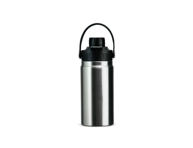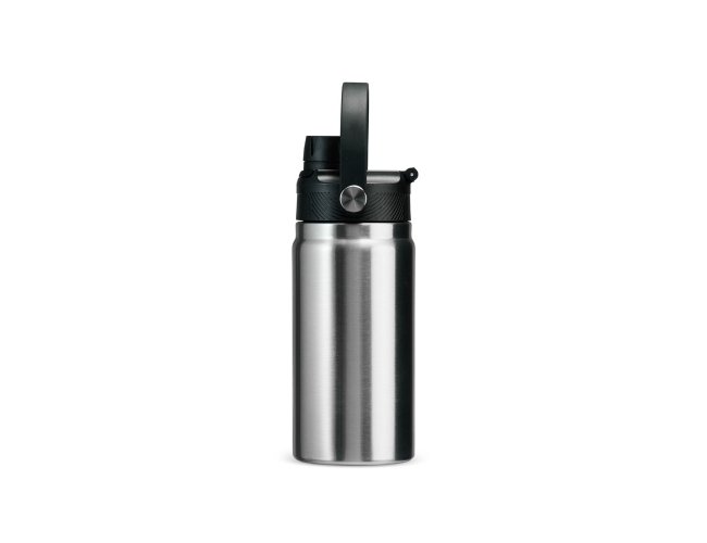 Garrafa térmica em inox com capacidade para até 400ml. Apresenta estrutura de parede dupla e vedação a vácuo, que mantém a temperatura de líquidos por mais tempo sem transferência para o exterior. Possui tampa plástica rosqueável com protetor de o bocal e alça fixa para transporte.