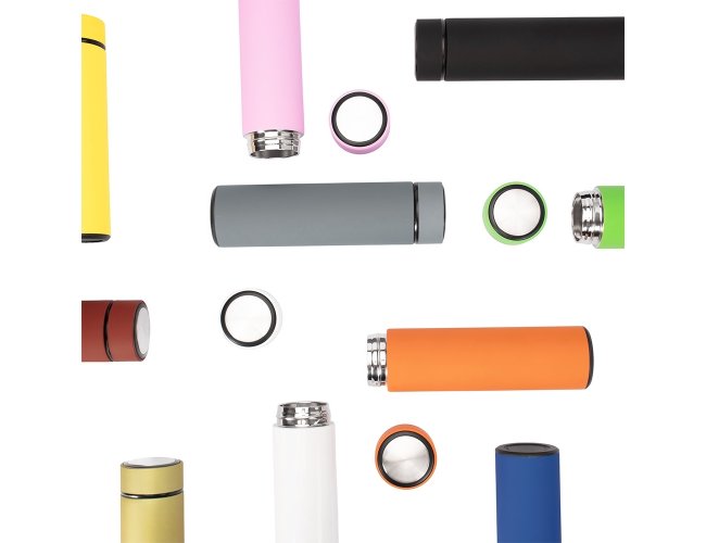 Garrafa térmica em inox com capacidade de até 500ml. Conta com tampa rosqueável e revestimento externo emborrachado que facilita a pegada. Possui parede dupla e isolamento a vácuo, o que permite conservar a temperatura de líquidos por mais tempo. Acompanha infusor em inox.