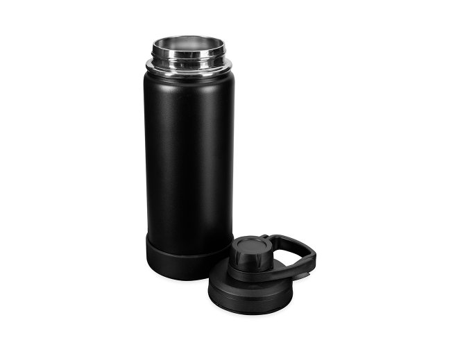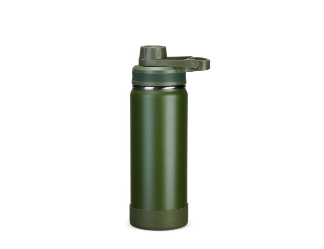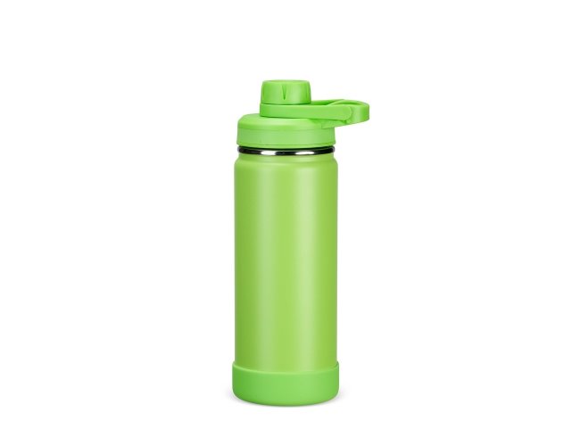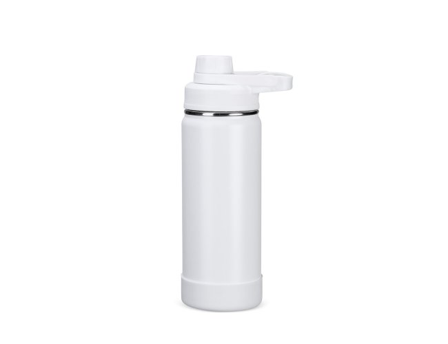 Garrafa térmica em inox com pintura eletrostática e capacidade de até 550ml. Mantém a temperatura de líquidos por mais tempo graças à estrutura de parede dupla e ao isolamento a vácuo. Possui tampa plástica rosqueável com protetor de bocal e alça fixa. Acompanha protetor removível em silicone para a base.