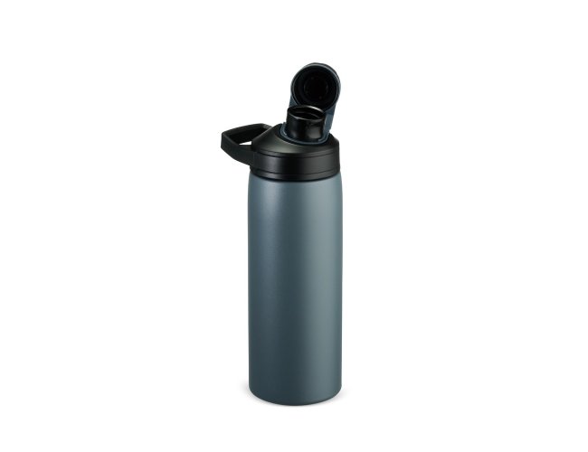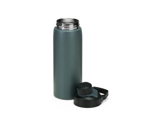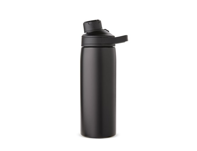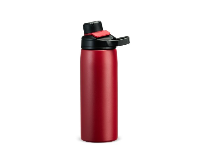 Garrafa térmica feita em inox com estrutura em parede dupla, vedação a vácuo e capacidade máxima de 600ml, ideal para manter a temperatura de líquidos por mais tempo. Possui tampa rosqueável em plástico resistente com protetor de bocal e alça fixa, em formato retangular, para transporte.