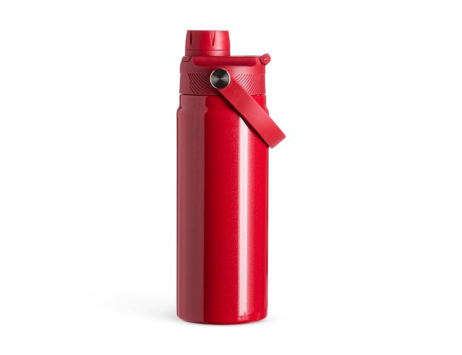 Garrafa térmica em inox com capacidade de até 600ml. Apresenta estrutura com parede dupla e isolamento a vácuo, permitindo conservar a temperatura de líquidos por mais tempo. Possui tampa plástica rosqueável com proteção para o bocal e alça fixa para transporte.