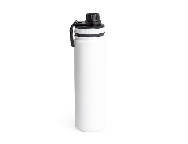 Garrafa térmica com capacidade de 650ml em inox com parede dupla, contém tampa plástica rosqueável com bocal e alça para transporte acoplados.