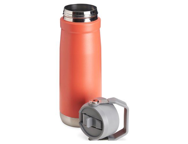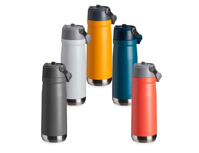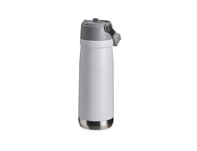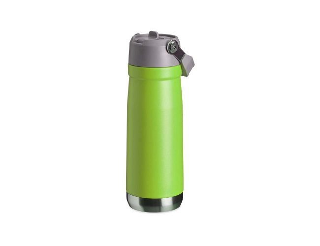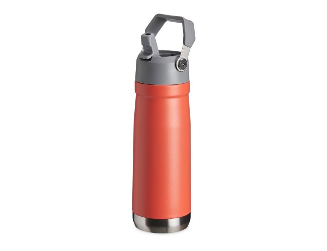 Garrafa térmica em inox de parede dupla, capacidade de 700ml. Tampa com alça de transporte, bico flip e canudo interno.
