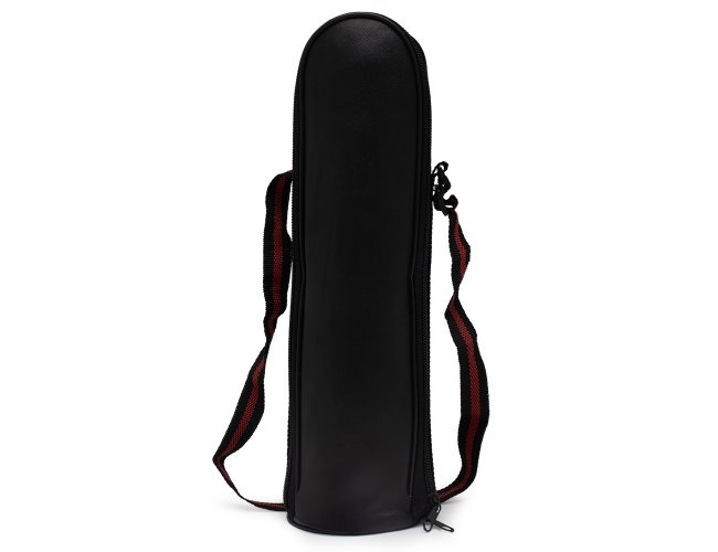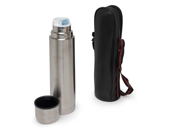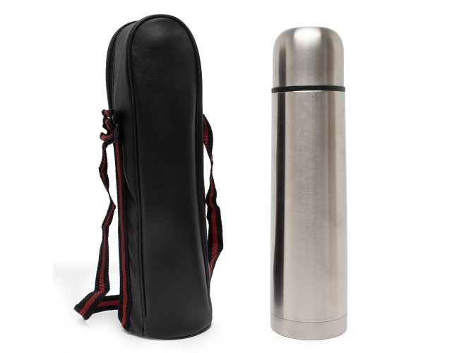 Garrafa térmica feita em inox parede dupla com capacidade de 750ml, acompanha capa de couro sintético com alça de nylon.