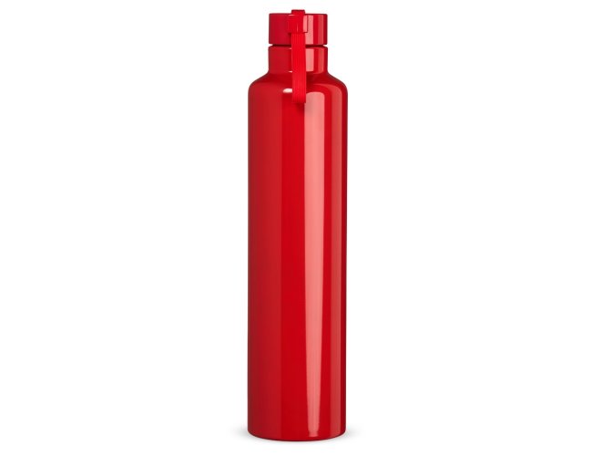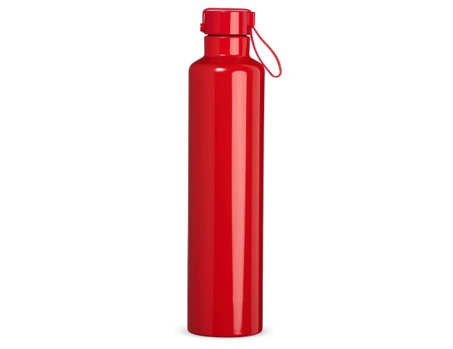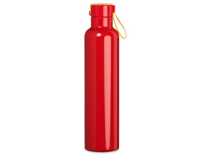 Garrafa térmica de inox 900ml. Contém tampa rosqueável e alça colorida de silicone acoplada na tampa.