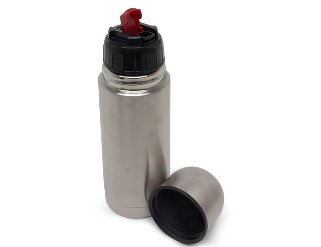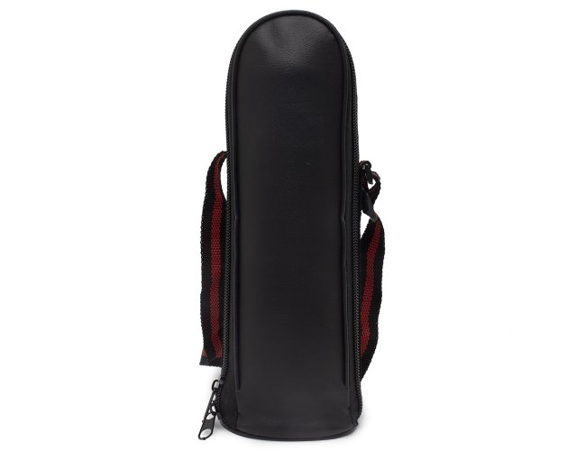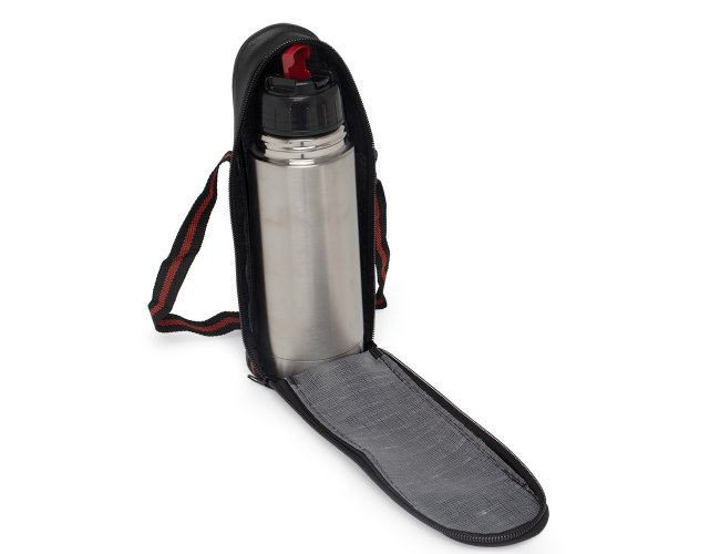Garrafa térmica 350ml em inox com tampa rosqueável, tampa interna em plástico resistente. Acompanha capa protetora de couro sintético com alça de nylon.