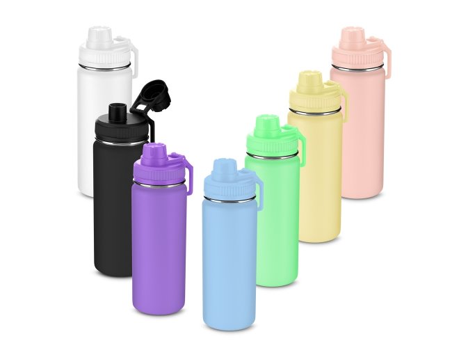 Garrafa térmica em inox com parede dupla com capacidade de até 570 ml. Tampa rosqueável, alça de plástico e anel de silicone para vedação. Pintura eletrostática.