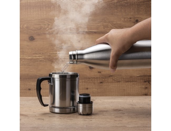 Garrafa térmica 780ml em inox de alta qualidade. Possui tampa rosqueável com detalhe superior em relevo, pode ser utilizada com líquidos quentes ou frios. Observação: não colocar no fogão ou micro-ondas.