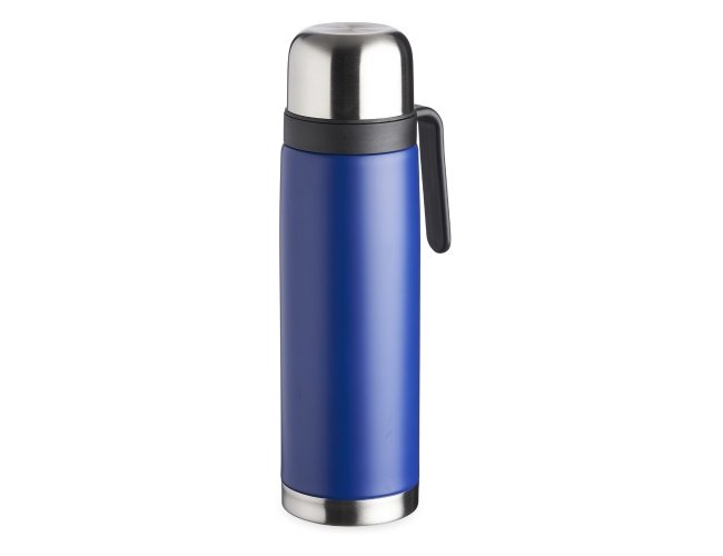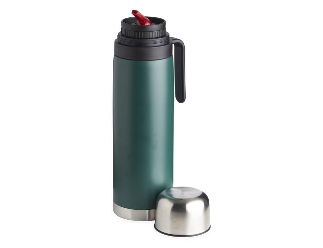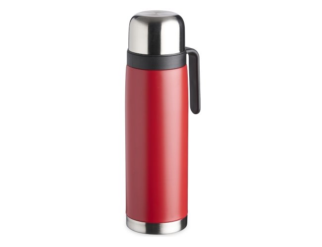 Garrafa térmica 900ml em inox com alça plástica. Possui tampa rosqueável, tampa interna rosqueável com bico plástico vermelho.