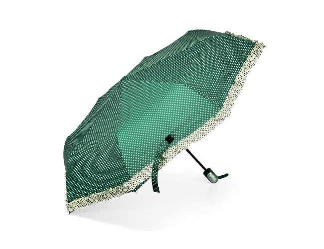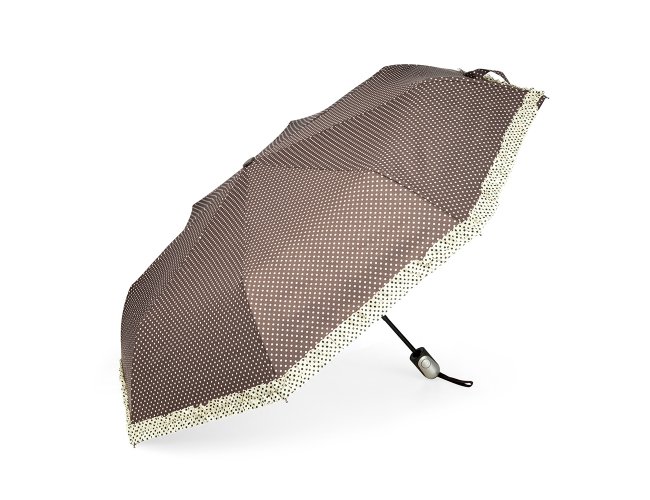 Guarda-chuva em poliéster com abertura automática por acionamento de botão. Possui estrutura metálica com oito varetas e pegador em plástico com alça de nylon fixa na ponta. Acompanha capa protetora.
