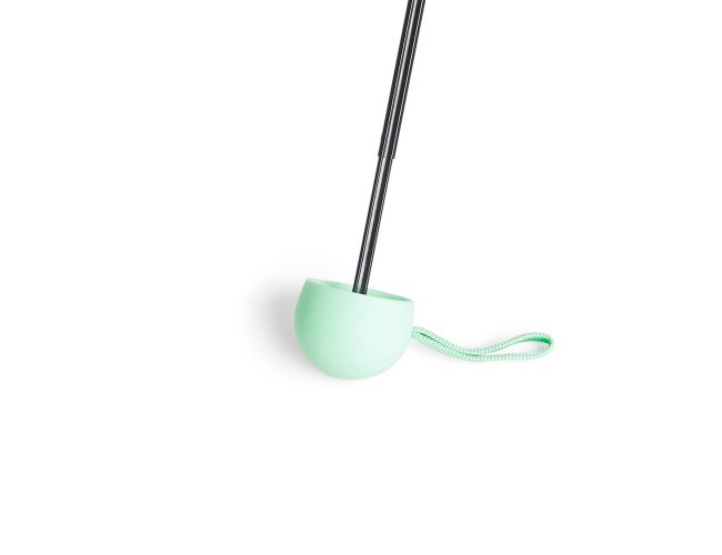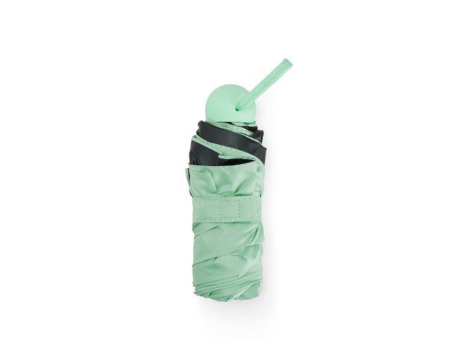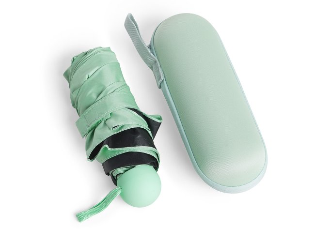 Guarda-chuva manual cápsula em poliéster de impacto impermeável e tecido interno em vinil. Com 6 varetas e estrutura em aço, possui pegador, botão de abertura e alça de Nylon. Acompanha estojo protetor com alça.
