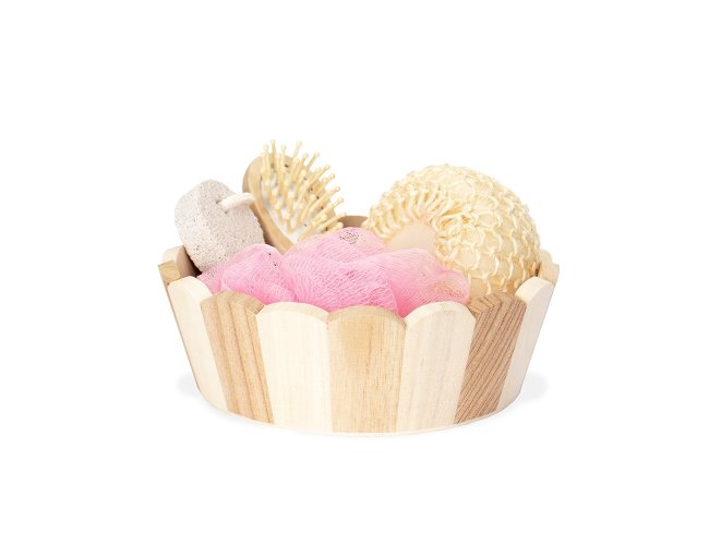 Kit banho com estilo natural envolvido em um cesto de madeira. Contém 4 itens: escova de madeira com cerdas macias, pedra-pomes, esponja redonda e uma esponja de nylon.