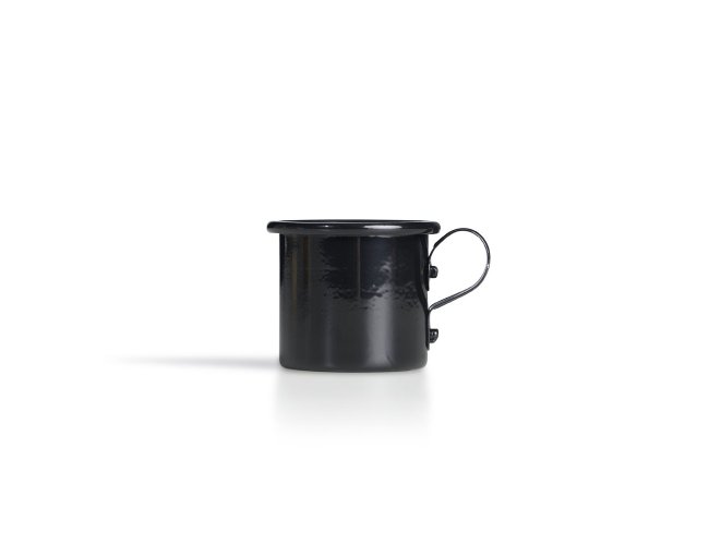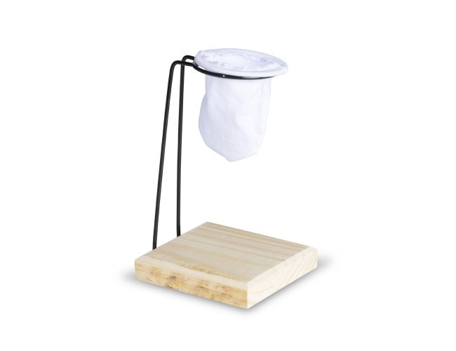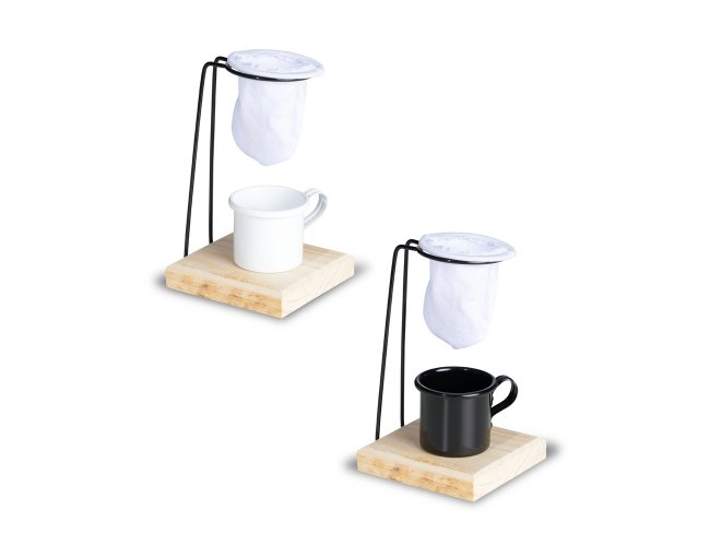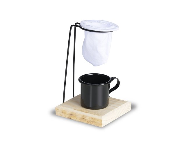 Kit Café 3 Peças contém: xícara de 120ml em metal, base de madeira com suporte para coador, e mini coador de café em tecido.