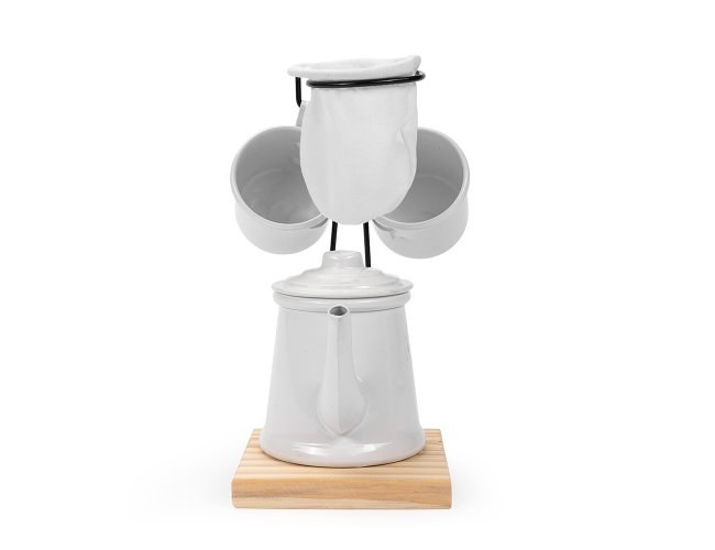 Um kit completo para preparar um café de forma especial em qualquer ocasião. O conjunto contém: 1 bule em alumínio com capacidade de 300ml, 2 xícaras em alumínio de 90ml cada e 1 coador em tecido com suporte de metal e base em madeira.