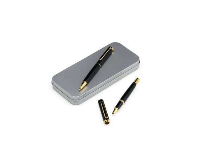 Descubra nosso sofisticado kit de canetas esfero e roller em metal, perfeito para quem valoriza estilo e funcionalidade. Com acabamento fosco, a caneta esferográfica possui acionamento por rotação e carga azul de 1.0mm, garantindo uma escrita suave e precisa. A caneta roller com carga de 0.7mm, oferece um traço delicado e fluido. Acompanha um estojo de metal revestido em espuma, que protege e exibe suas canetas com elegância.