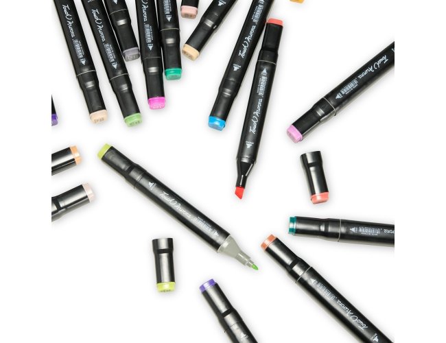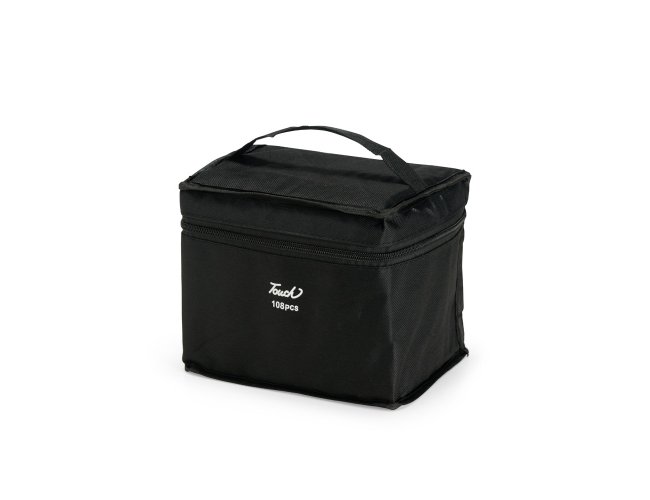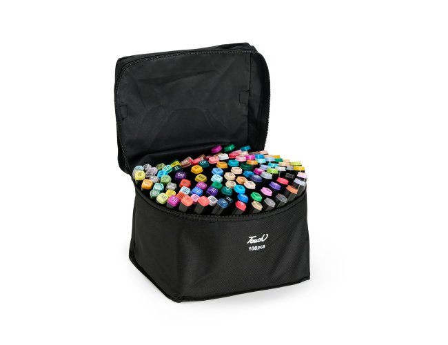 Kit com 108 canetas marcadoras feitas em plástico com pontas duplas: uma fina e outra chanfrada grossa. Acompanham bolsa com alça e fechamento em zíper para transporte.