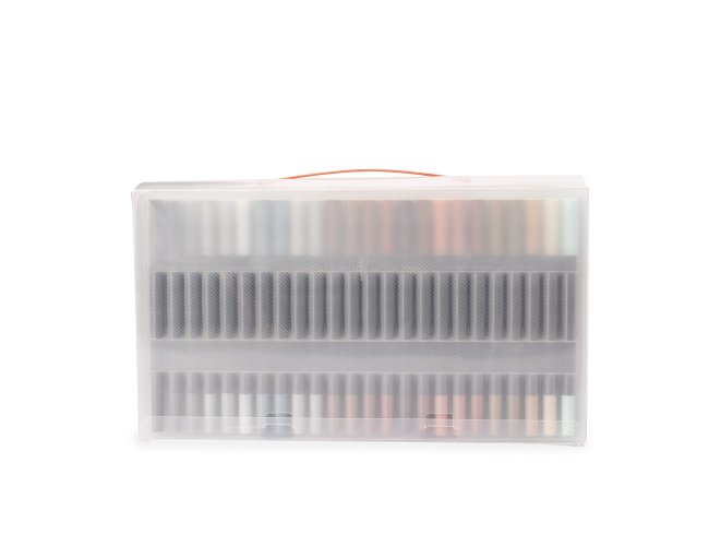 Kit com 144 canetinhas coloridas de pontas duplas: uma fina e outra em formato de pincel. Cada canetinha possui corpo leve em plástico e tinta à base de água, livre de odores e atóxica. Acompanha estojo plástico com fechamento em botões e alça para transporte.