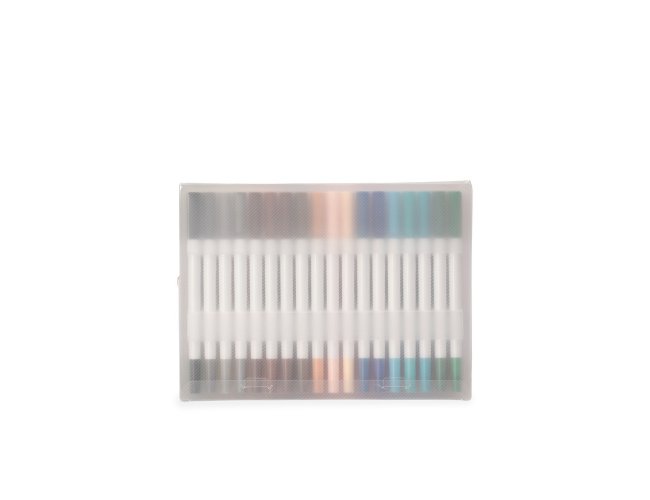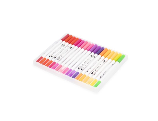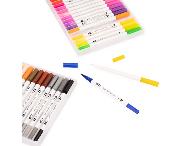 Kit com 36 canetinhas coloridas de pontas duplas: uma fina e outra em formato de pincel. Cada canetinha possui corpo leve em plástico e tinta à base de água, livre de odores e atóxica. Acompanha estojo plástico com fechamento em botões.