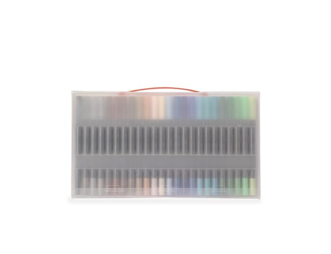 Kit com 48 canetinhas coloridas de pontas duplas: uma fina e outra em formato de pincel. Cada canetinha possui corpo leve em plástico e tinta à base de água, livre de odores e atóxica. Acompanha estojo plástico com fechamento em botões e alça para transporte.