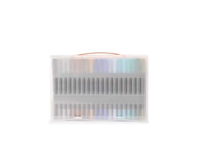 Kit com 60 canetinhas coloridas de pontas duplas: uma fina e outra em formato de pincel. Cada canetinha possui corpo leve em plástico e tinta à base de água, livre de odores e atóxica. Acompanha estojo plástico com fechamento em botões e alça para transporte.