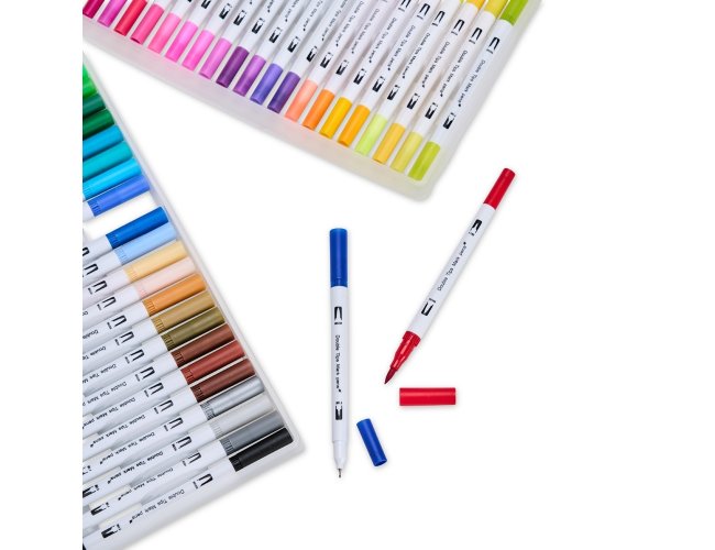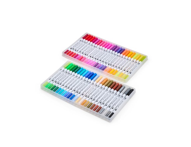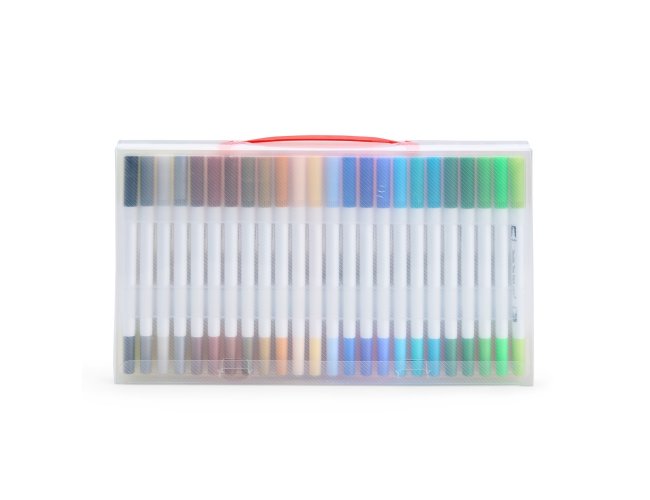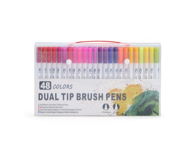 Kit com 48 canetinhas coloridas de pontas duplas: uma fina e outra em formato de pincel. Cada canetinha possui corpo em plástico e tinta à base de água, livre de odores e atóxica. Acompanha estojo plástico com fechamento em botões e alça para transporte.