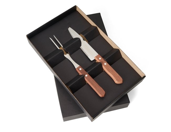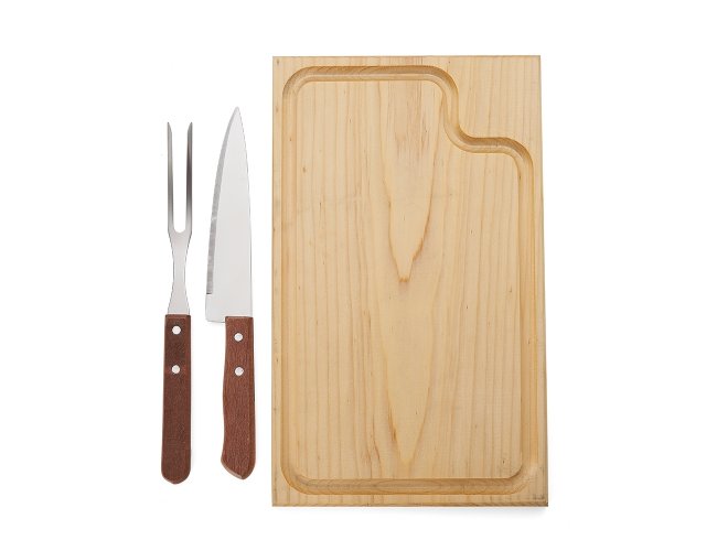 Kit churrasco três peças em estojo de papel kraft, contém: faca, garfo e tábua de corte com canaleta.