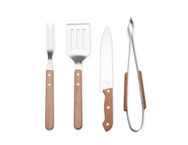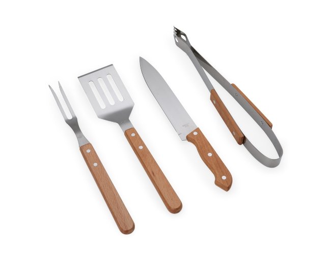 Prepare churrascos memoráveis e deliciosos com o nosso kit com quatro peças essenciais: espátula, garfo, pegador e faca de 7 polegadas, todas em aço inox com cabos de madeira, acomodadas em um estojo de nylon que facilita o armazenamento e transporte. Para maior exclusividade, acompanha uma plaquinha metálica personalizável com verso autoadesivo.