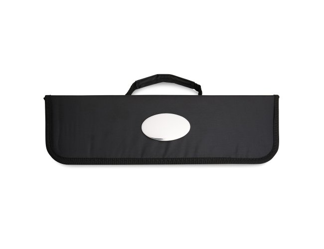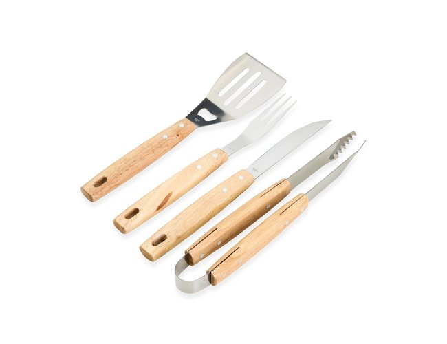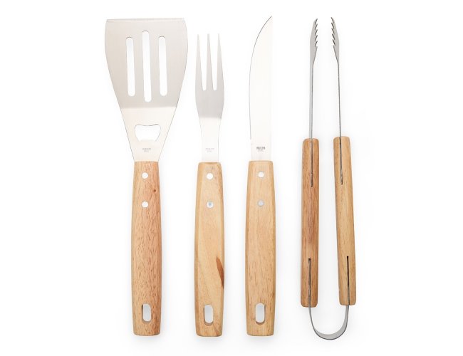Praticidade para qualquer churrasco! Este kit conta com quatro peças essenciais: espátula, garfo, pegador e faca de 6 polegadas, todas em aço inox com cabos de madeira, acomodadas em um estojo de nylon que facilita o armazenamento e transporte. Para maior exclusividade, acompanha uma plaquinha metálica personalizável com verso autoadesivo.
