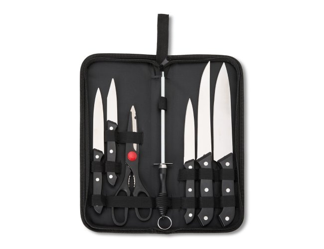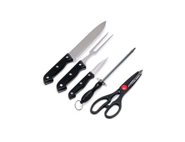 Churrascos irresistíveis começam com os utensílios certos! Nosso kit de 5 peças em inox, com cabos plásticos e estojo em nylon, inclui: uma faca chef de 7 polegadas, versátil para diversas tarefas na cozinha; uma faca de legumes de 3 polegadas, ideal para descascar e cortar vegetais; um garfo perfeito para dominar a grelha; uma chaira, essencial para manter as facas sempre afiadas; e uma tesoura multiuso para cortar alimentos, legumes, verduras e carnes. Além disso, a tesoura possui pequenos dentes entre os cabos que funcionam como um quebra-nozes. O kit também acompanha uma plaquinha de metal, permitindo personalizar e dar um toque único ao churrasco. Este kit é perfeito para preparar churrascos deliciosos!