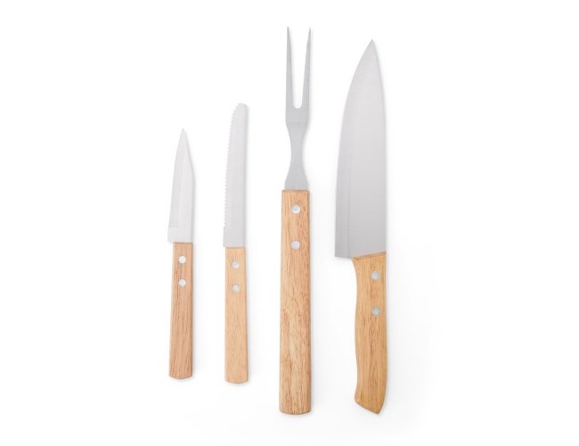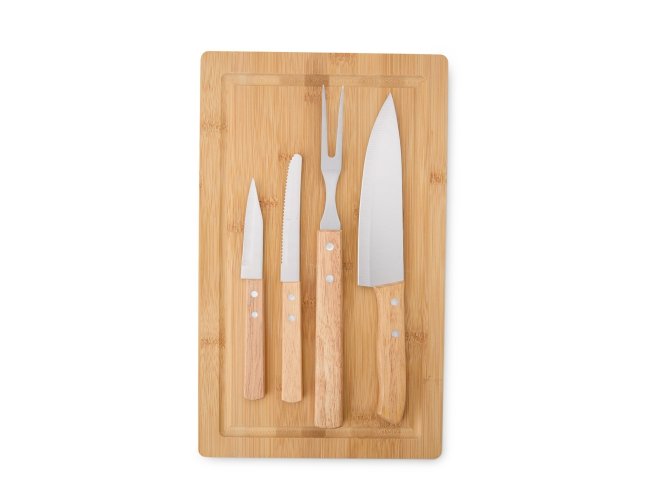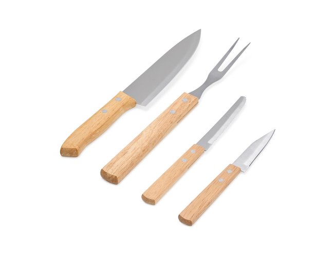 Kit para preparar os churrascos mais deliciosos, composto por cinco peças com lâminas em aço inox e cabos de madeira. Inclui três facas de 3", 4" e 6" polegadas, um garfo e uma tábua de bambu, todos acomodados em uma caixa de papelão. É a escolha perfeita para quem aprecia uma boa carne em momentos de celebração.