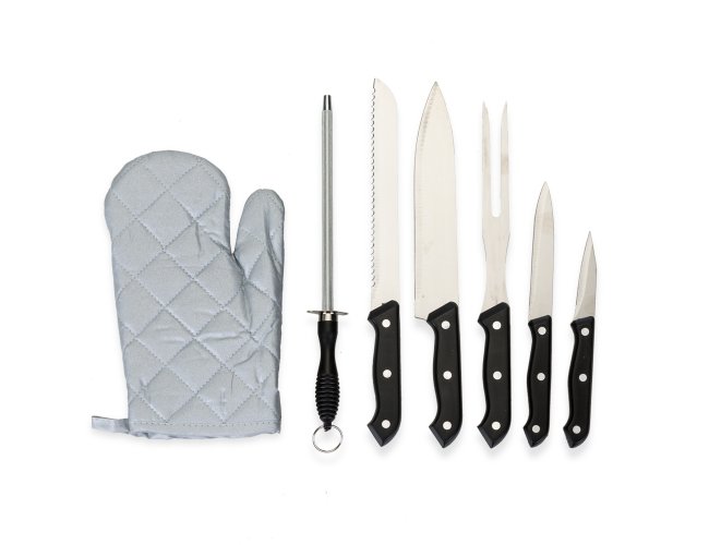 Kit churrasco 7 peças com estojo, contém: faca de chef, faca para desossar, faca de serra, faca de legumes, garfo, chaira e luva. Estojo com alça para transporte e área interna com elástico de fixação para os utensílios.