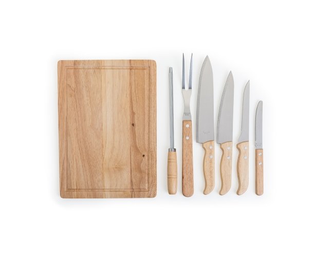 Kit churrasco 8 peças com cabo em bambu, lâminas em aço inox e avental de nylon. Acompanha tábua em bambu com canaleta, 3 facas de corte e uma faca de serra cabo, chaira, garfo e avental prata com bolso. Acomodados em uma maleta de nylon preta. Rebites em Aço Inox, um dos mais resistentes à ferrugem e corrosão.