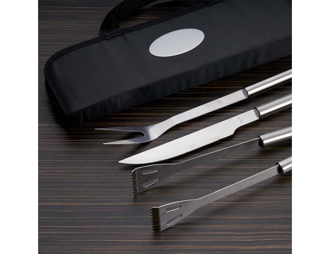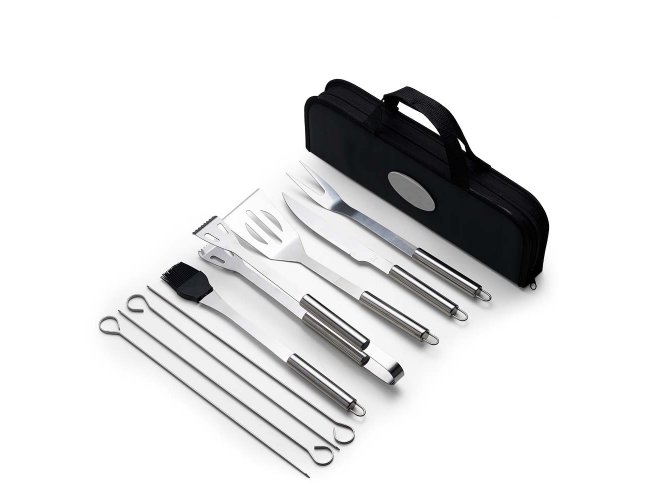 Kit Churrasco 9 Peças em estojo de nylon com alça. Contém: pegador, garfo, espátula, faca, pincel e 4 espetos. Utensílios de inox com proteções plásticas e parte interna com velcro para fixação das peças, acompanha plaquinha metálica para personalização.