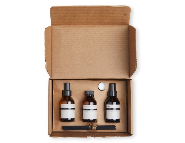 Home Spray e difusor em frasco de vidro de 100ml, com essência de Cedro Verde, e Água de Lençol em frasco de vidro de 100ml, essência de Alecrim. Acompanha um tampa com rosca e furo para o frasco de vidro do difusor e 6 varetas.