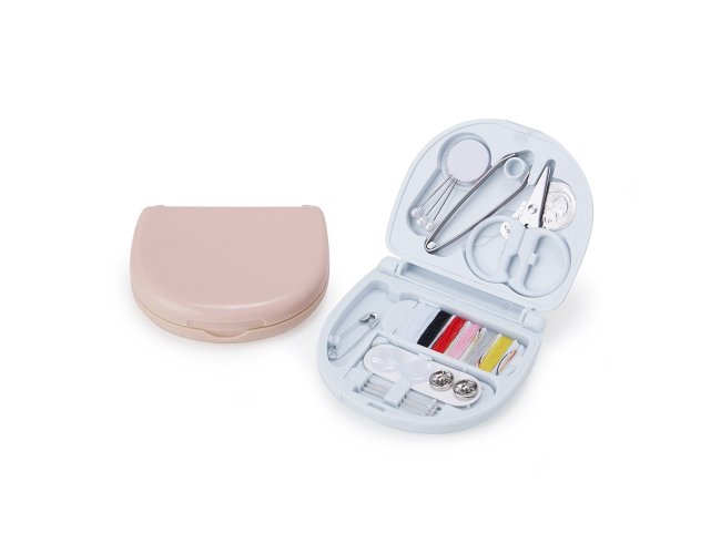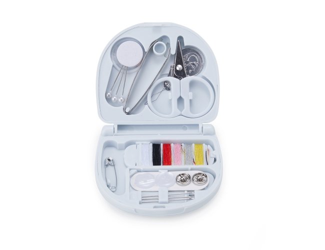 Kit costura plástico com acabamento fosco, contém: três alfinetes de cabeça, pinça, mini tesoura, passador de linha, conjunto com 6 linhas, alfinete de segurança, dois botões, dois colchetes de pressão e três agulhas.