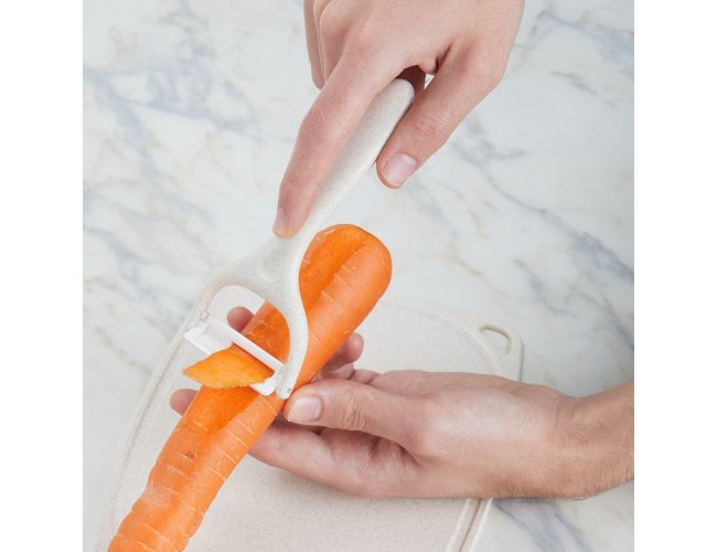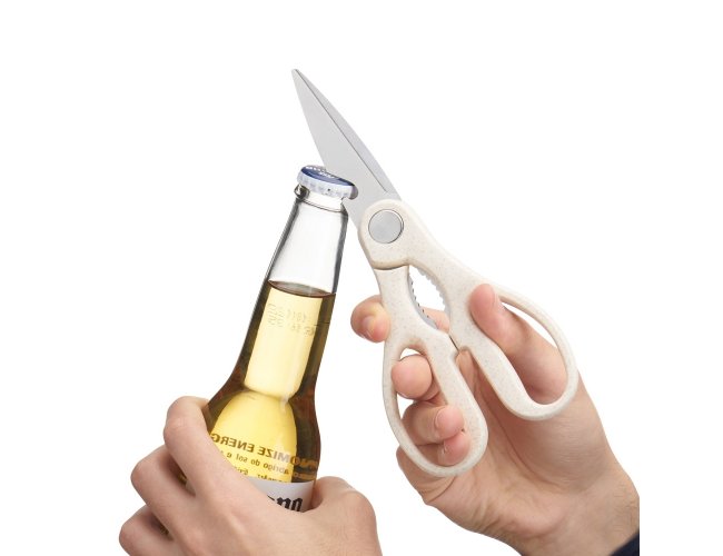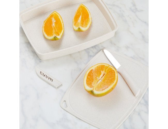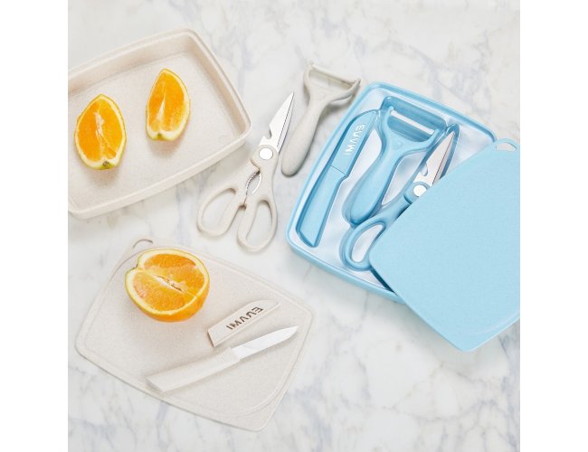 Kit Cozinha 3 Peças em plástico de palha de trigo e inox. Contém tesoura culinária, faca com protetor e descascador de legumes. Acompanha bandeja e tampa, podendo ser utilizada como recipiente e tábua para corte.