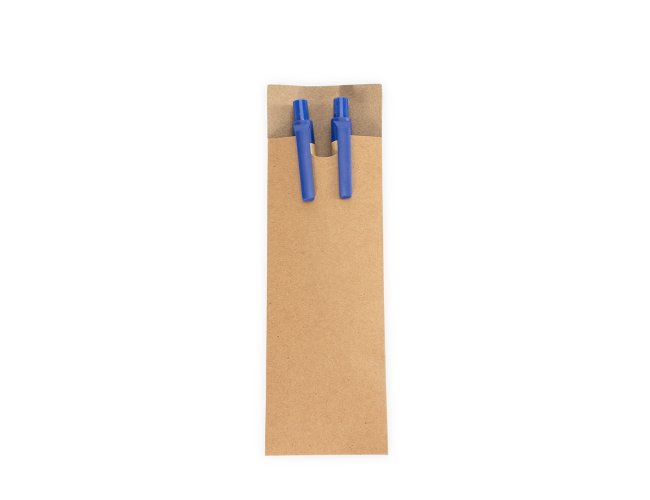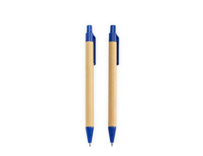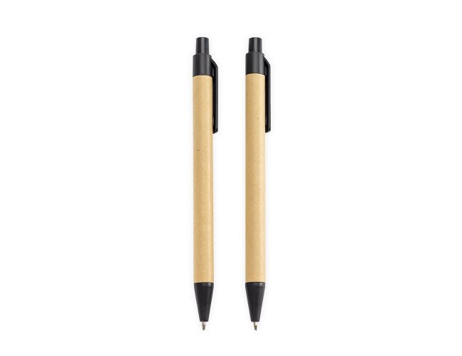 Kit de caneta e lapiseira ecológicos com estojo em papelão. A caneta possui corpo em papelão com ponta, clipe e acionamento por clique em plástico, além de carga esferográfica azul de 1,0 mm. A lapiseira segue o mesmo design, equipada com mina de grafite de 0,7 mm.