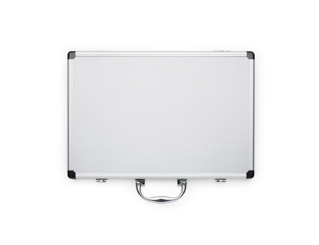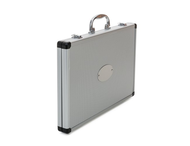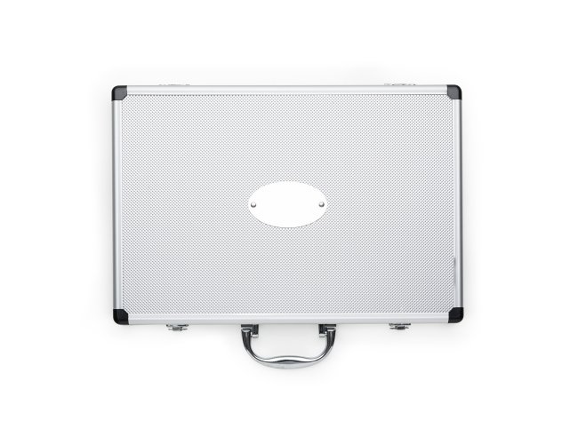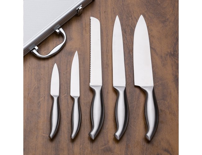 Kit Facas 5 peças em maleta de alumínio texturizado com placa central para personalização. Possui cinco facas(com proteção plástica) inteiras inox em tamanhos diferentes, parte interna da maleta revestida com veludo e possui também elásticos para fixar as peças. Parte externa da maleta possui uma alça e bordas plásticas pretas, duas dobradiças inferiores e parte superior com duas travas.