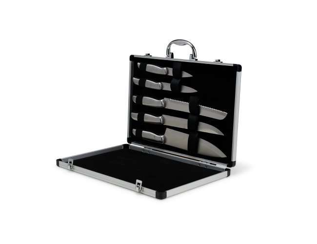 A solução ideal para quem valoriza qualidade nos cortes e organização na cozinha. O kit inclui 5 facas em aço inoxidável, com diferentes tamanhos, perfeitas para uma experiência gourmet. Acompanha uma maleta de alumínio texturizado, com interior revestido de veludo e duas travas que garantem maior segurança. Além disso, a maleta oferece espaço para personalização, tornando o kit ainda mais exclusivo.