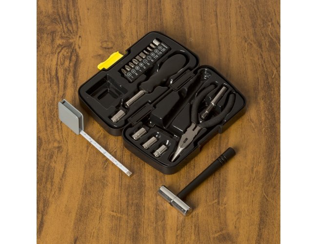 Kit ferramenta 19 peças de maleta plástica. Possui: alicate, chave que alonga ferramenta auxiliar, martelo, 4 extensores bocais(7MM, 8MM, 9MM e 10MM), chave auxiliar, trena 1 metro(sem trava) e conjunto 10 pontas(4 chaves phillips, 2 chaves fenda, 3 chaves torx e um adaptador). Estojo plástico com trava amarela, frente e verso texturizado com bolinhas, possui área central lisa de ambos lados.