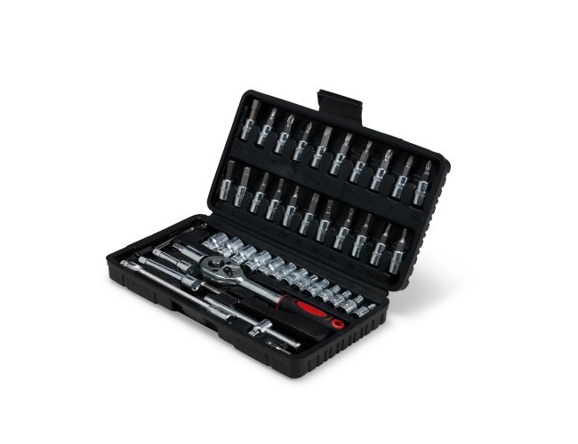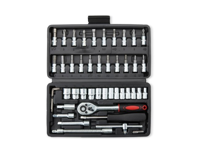 Solução para reparos, garantindo precisão ao apertar ou afrouxar parafusos. Nosso Kit com 45 peças é perfeito para diferentes tarefas de manutenção. Composto por 1 chave catraca reversível, 13 soquetes, 21 soquetes com bits, 1 ponta Torx, 3 chaves hexagonais, 1 cabo Fixo, 1 junta universal, 1 cabo de força em T, 1 adaptador de bits e 2 extensões flexíveis. As peças vêm organizadas em uma maleta de plástico resistente, garantindo que tudo fique sempre em ordem e fácil de transportar.