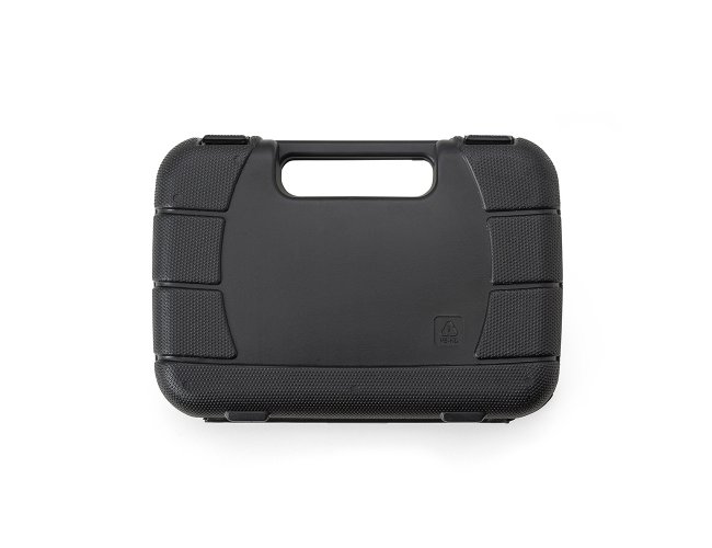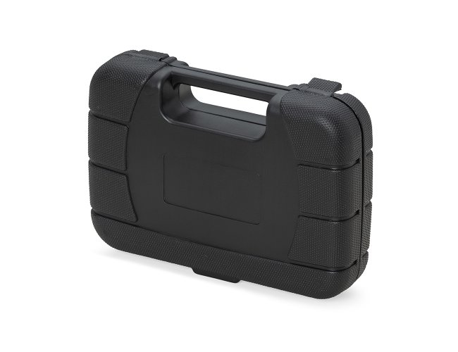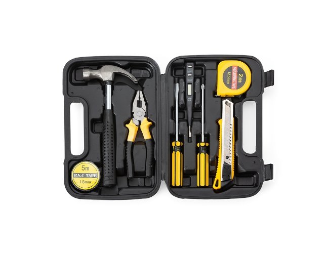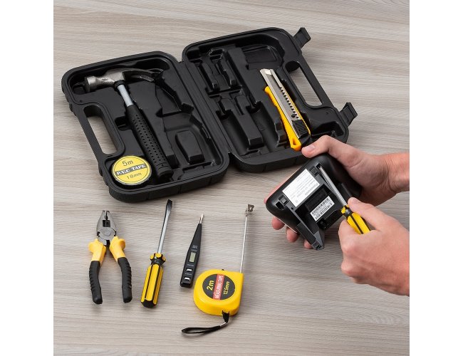 Kit ferramenta 8 peças em estojo plástico. Maleta plástica com detalhe retangular no centro frontal e verso liso, possui texturização no estojo e duas travas superiores. Acompanha: fita isolante, martelo, alicate, chave Philips, chave teste, chave de fenda, trena 2 metros e estilete.