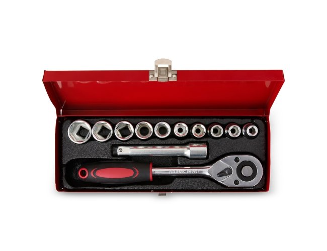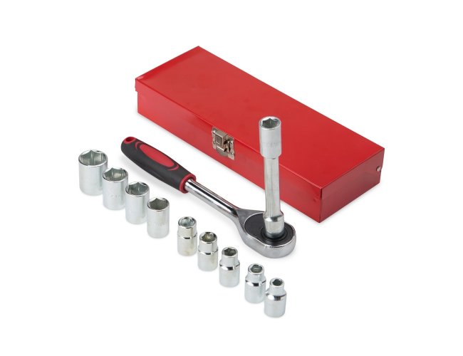 Kit ferramenta com 12 peças em estojo metálico. Contém: 1 chave catraca, 1 chave extensora e 10 soquetes
