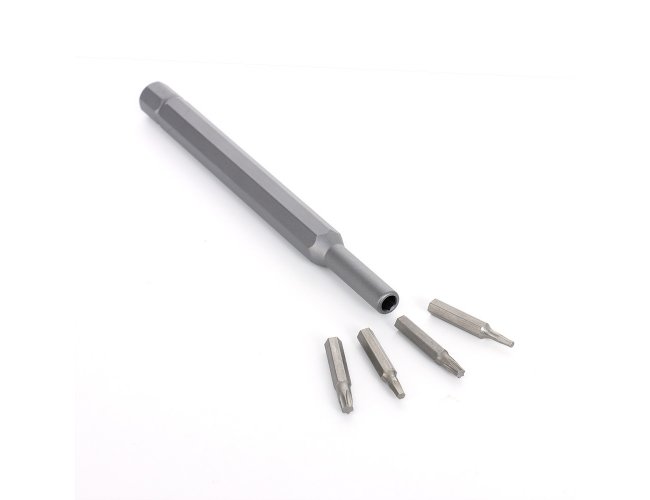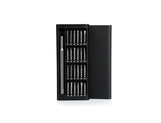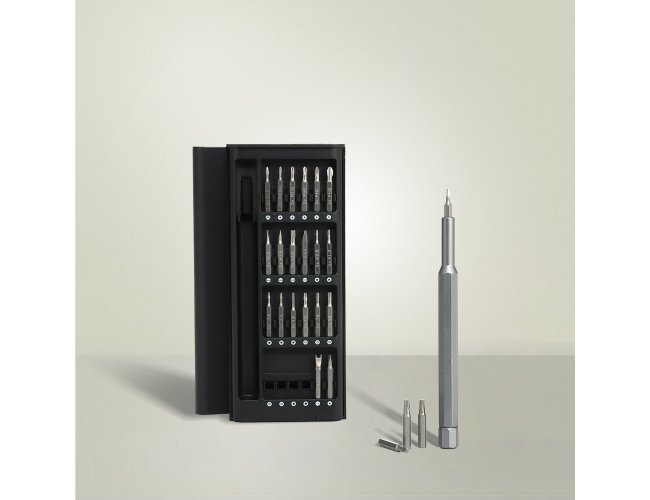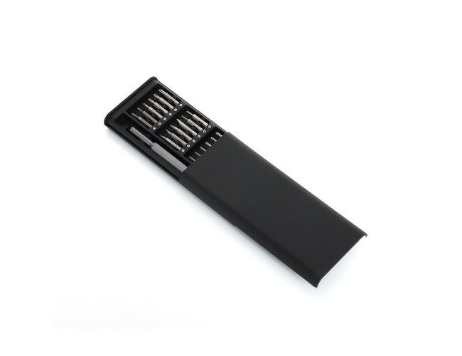Kit ferramenta com 25 peças em estojo plástico com tampa de encaixe. Contém: 1 chave extensora rotatória para conexão das ponteiras, 1 ponteira Tri-Wing, 5 ponteiras Phillips, 4 ponteiras fenda, 10 ponteiras Torx, 2 ponteira Allen, 1 ponteira spanner e 1 ponteira fenda triangular.