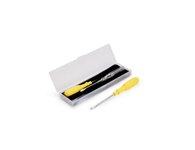Kit de ferramentas com três chaves de cabo feito em plástico, haste e ponta metálicas. O conjunto conta com chave de fenda, chave Phillips e uma chave de teste de tensão. Acompanha estojo plástico com espuma removível para acomodar as ferramentas.